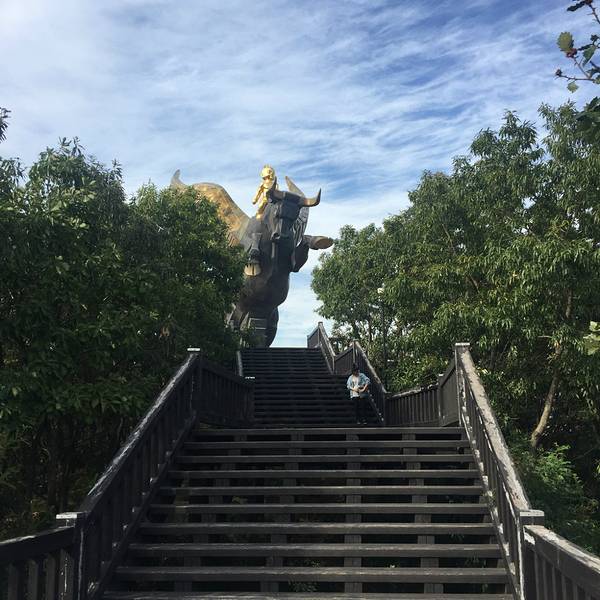...临海有很多恐龙浮雕,山顶有飞碟状登高塔,有童牛飞天雕塑,山上有小鹿,可以喂,适合玩4个小时左右