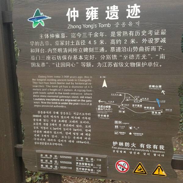 还有近一个多月的时间我就为去常熟做了很多准备,看了很多人的攻略,尚湖和虞山算是比较著名的景区了,带着期待到了常熟,因为时间有限,最后圈定去仲雍墓、言子墓、常熟博物馆,这几个景点都在一起。从新城区打出租车到这里不算太远,10几分钟时间,16元的路费。仲雍墓是据史学家考证,距今有3000多年的历史了,就在虞山的东麓,紧挨着马路。这里有段典故就是周文王的父亲季厉排行老三,上面有2个哥哥,泰伯、仲雍,本来老三没有资格继承王位,但是老大、老二看出父亲想法“让老三继位”,史书上说季历贤于二位哥哥,估计是瞎掰吧,历史总是为胜利者书写。泰伯和仲雍就悄悄逃到南方,过去常熟这个地方算是蛮夷之地,没有开化,仲雍建立起吴国,我就很纳闷,为什么要逃那么远,估计不逃就没命了,有时候历史很残酷的,后来周成王封吴国的伯父的后代为子爵,算是认可了。后世帝王为了统治的缘故,一直美化这件事。就有了让国一说。言归正传,仲雍墓正面是一个牌坊,左侧是清权祠,牌坊上写着“功建先贤仲雍墓门”,看起来有些年代了,墓道右侧地上有个石碑,江苏省重点文物保护单位,石碑山布满绿苔,看起来很有历史沧桑感。第二道牌坊正面“南国友恭”背面“让国同心”,再往上走左侧是一个茶社,右侧是一个休息亭子最后一道牌坊“先贤仲雍墓”后面就是墓冢了,石头砌得四周,上面有封土,背后就是十里虞山,仲雍静静地躺在这里3000多年了,小伙伴,是不是很有点探古怀幽的感觉呢。 我的旅游时间:2015年11月11日下午。 适合旅游时间:1-12月份。 推荐游玩时间:1小时。 费用:免费