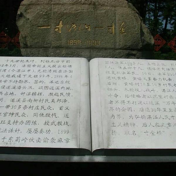 寸金桥公园不但风景秀丽,环境幽雅,而且还是湛江市政府定为爱国主义教育的基地。记载着湛江市人民抗法斗争英雄的寸金桥,从公园月影湖的排水渠上跨过,把公园北苑和圮苑两大景区分开。抗法英雄塑象庄严地沾立在公园大门宽敞的广场上,正气凛然,威武不屈,是湛江人民的英雄形象!刻在纪念上的“一寸河山一寸金”七个大字,金光闪闪!它是湛江人民殊死保卫祖国河山的铿锵誓言!象征着湛江人民英勇无畏的精神,永放光芒!