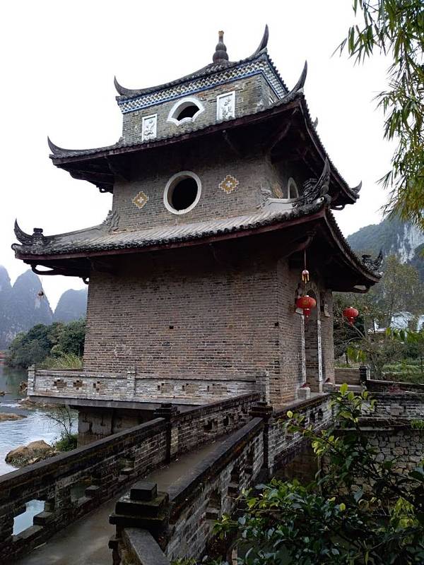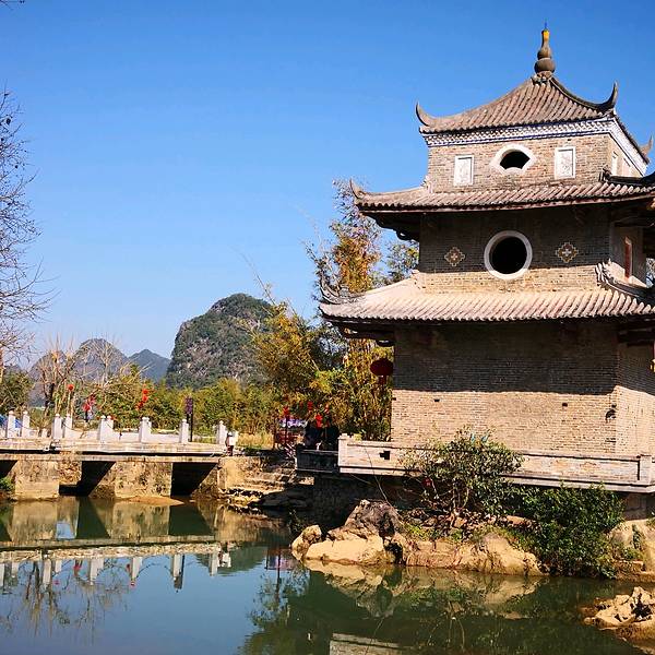 我们进入景区,沿着绣球街而行,街边房屋全都是新建的。虽然叫古镇,但全然没有古镇味道。只有壮音阁大戏台还有点古色古香。穿过小镇,直达镇东的文昌阁附近。这里山青水秀,田园似绵,风景如画,是旧州景区的核心地带。文昌阁耸立在鹅泉河的小岛上,有小桥直通阁里。阁高15米,四角三层,建于明清年代,是旧州标志性建筑。