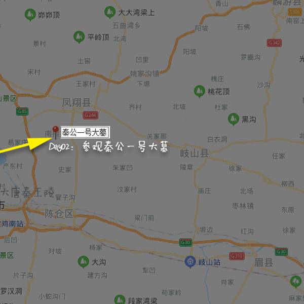 交通:宝鸡汽车站乘坐宝鸡至凤翔的汽车,该车路过位于凤翔南指挥镇的秦公一号大墓门前