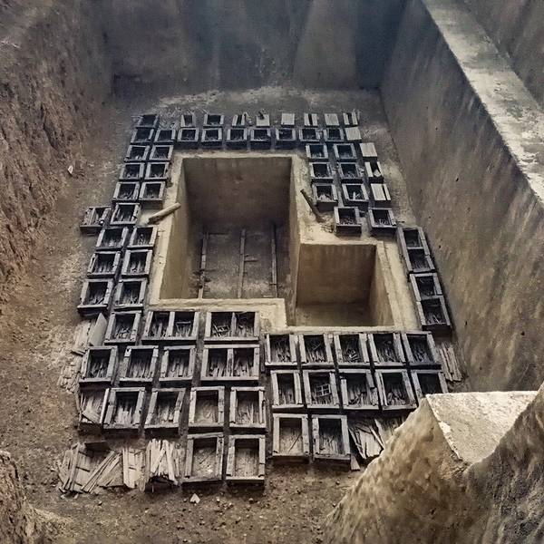 椁室内有柏木“黄肠题凑”椁具垒砌而成的长方形木屋,主椁室中部的地下,还有一个60厘米见方的“腰坑”,内有小动物骨骼,这是周秦墓葬中常见的一种葬俗。主椁安放秦公遗体,分为前后两室,这种布局仿照墓主生前居所“前朝后寝”的样式。 秦朝及之前的朝代帝王陵墓都有很多人殉葬,这个墓中有多达186具殉人,包括环椁室周围的殉人166具,和填土中埋人牲20具,可见当时的残忍。我们现在看到主椁周围一圈放了很多木质棺椁,叫殉箱,里面都是殉葬的人的遗体,而木质至今仍保存完好。