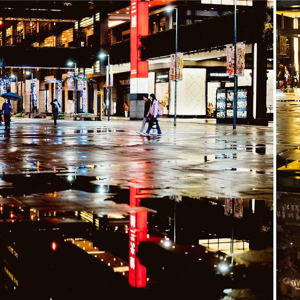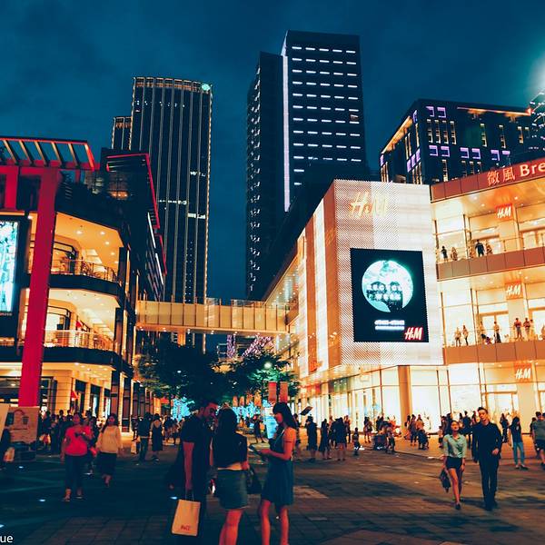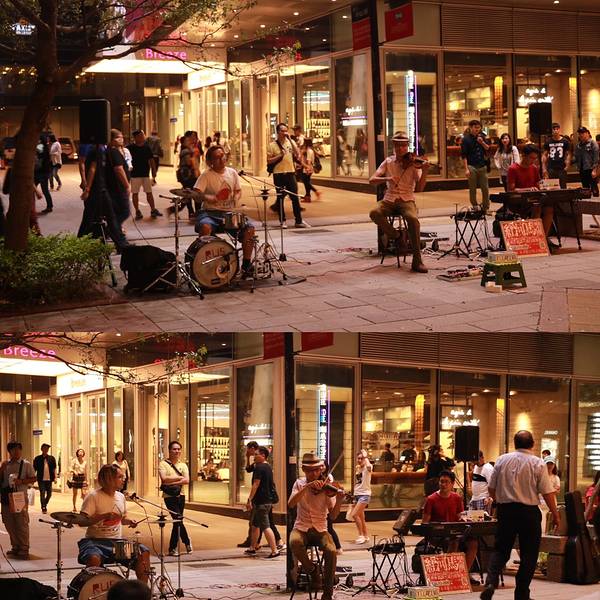 信义商圈是时尚奢华的代表,夜晚的新光三越购物区,灯火辉煌。广场上也有许多卖艺的艺人和演出。