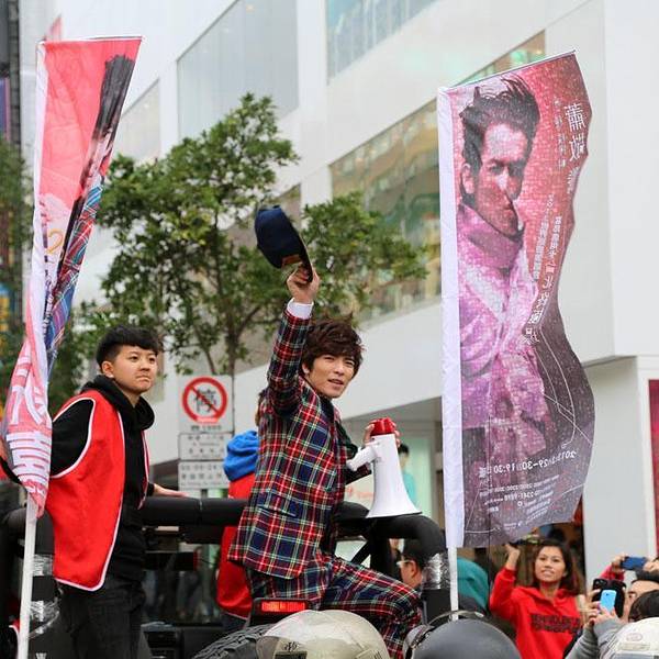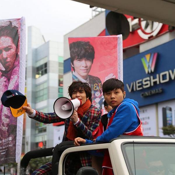 车子从星野铜锣烧出发,就看到打着萧敬腾大旗的吉普车缓慢的沿着路边行驶,开始以为只是雨神的粉丝团,再定睛一看,竟然见到了雨神本尊,而且正在给粉丝发红包哦。Andrew见我跟小雪兴奋的不行,边跑下车叫雨神向...车子从星野铜锣烧出发,就看到打着萧敬腾大旗的吉普车缓慢的沿着路边行驶,开始以为只是雨神的粉丝团,再定睛一看,竟然见到了雨神本尊,而且正在给粉丝发红包哦。Andrew见我跟小雪兴奋的不行,边跑下车叫雨神向我们这边看,然后这张我最满意的照片就诞生了~之后很长一段路上,我们的车子都一直跟雨神的宣传车队并行,我跟小雪一边将头伸出车窗贪心看着,一边大声喊着。等过了一会雨神的车队转弯,我们以为这段追星之旅就结束了,谁想到在信义商圈的街道上又再次碰到了萧大神,这次他还走下车给大家发红包呢,近距离接触,结果只顾着拍照却忘记伸手掏红包了,没追过星经验实在不够足啊。