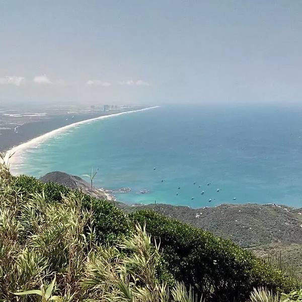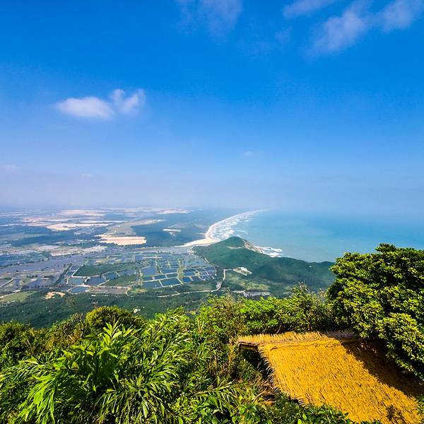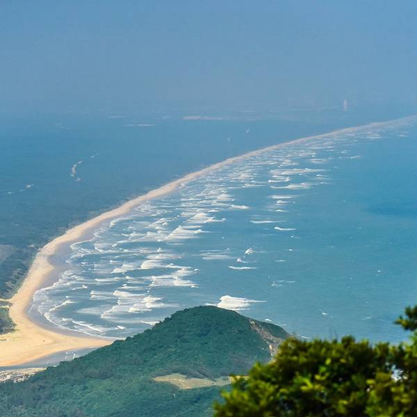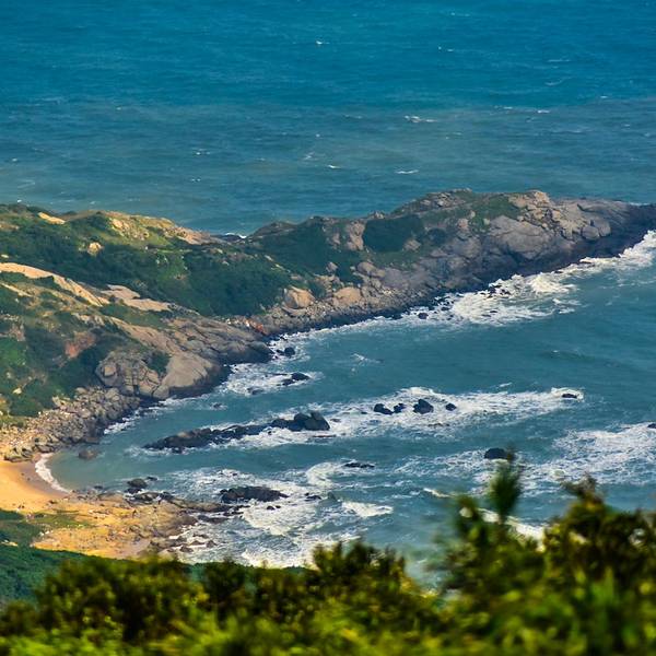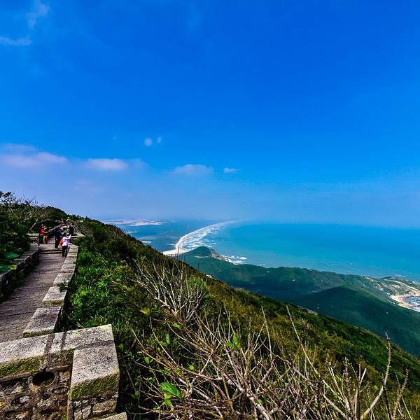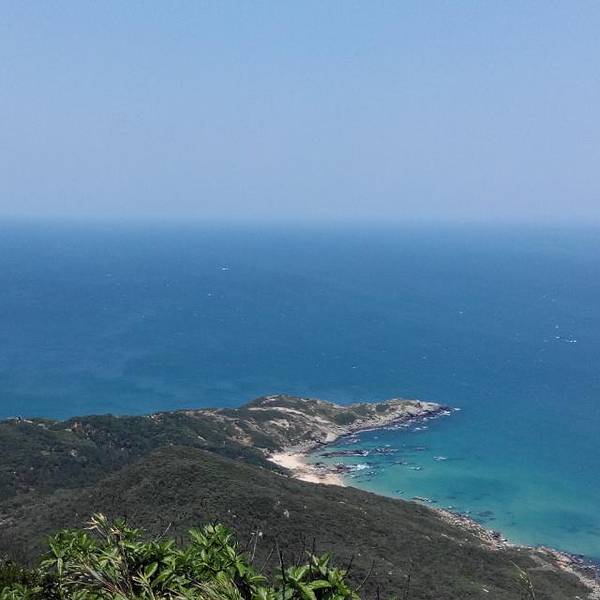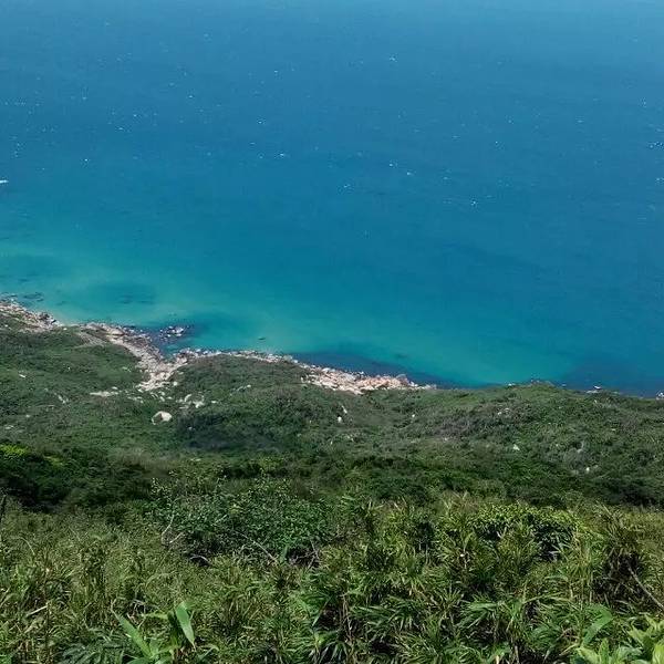 在晴朗的日子里到达顶峰可以看到整个蓝天与大海的和谐之景色令人心旷神怡,在海风作用下让下面的海湾与陆地接壤的地方形成一层层巨大的浪花,弯月般的湾沟就是我们传说的月亮湾了,用月亮一词来描述这里的湾沟真的是很恰如其分。除此之外,还能在山顶之上看到大大小小的古刹、怪石以及各种形状的山脉。此时此刻的你一定不知道到底是山在海上还是海在山脚下。在月亮湾的左侧有一大片农田改制而成的梯田湖泊,在山顶上显得非常的漂亮而惊艳。这里梯田状的湖泊非常像是一片很大的青色袈裟守护着这里的海域不被外敌所侵犯。