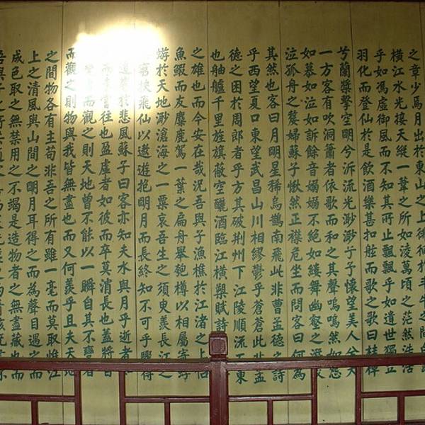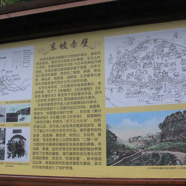 位于黄冈郊区长江边,苏东坡误以为是三国的古战场。因为有岩石突出像城壁一般,颜色赭红色,所以叫赤壁。这里有历代名人书画碑刻近两百块,苏东坡的碑刻尤其多。
