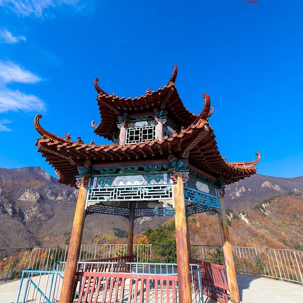 金骆驼 刚下高速就看这样的美景~▲登到半山腰的一处平台,向下拍,美极了。▲到哪都有这样的中国风特色其实此行的原定目标就是喇叭沟,后来觉得都去那么远了,不如再远点,就去了雾灵山。