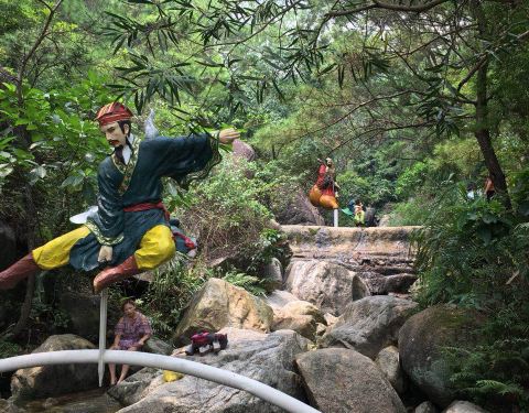 北辰山人文古迹众多,自然景观也很不错,在这里可以了解五代闽王王审知的事迹,还可以看宏伟的王审知雕像。此外,这里有王公庙,可以烧香拜拜。当然,这里有名的景点还是要数十二龙潭瀑布。北辰山,又称"北山",位于厦门市同安区东北隅,在同安五显镇境内,毗邻南安,距同安城区12公里。山的终点是牛岭峰,到山顶要2个多小时,到后面很陡,简直可以算得上是垂直向上,爬起来还是有点累的,然后下山还需要步行1个多小时。但是来此,大部分的游客攀顶的较少,大部分是游览到北辰山有名的十二龙潭瀑布作为终点。一入旧山门,可以看到香火鼎盛的庙,叫王公庙,又称广利庙,是五代闽王王审知兄弟开闽的肇始地。为纪念王审知的德政,百姓在起事的竹林间立祠堂,修衣冠冢。庙内悬挂有宋太祖赵匡胤特赐御匾“八闽人祖”。如果有兴趣的话,可以去拜下,金纸和香的费用需要自理,单项大约为10元。再往前是卧龙广场,可以观察下广场上的龙,都是四爪龙,古代的五爪金龙是帝王专用,而王审知说“宁做开门节度使,不做闭门天子”,所以他是只称王不做帝,因此雕刻的是4爪龙。然后再往前的王审知雕像处可以拍照留念,雕像看上去还是蛮雄伟的。继续往前都是些自然景观,狭窄的山路,美丽的野花,木栈道以及观景亭,沿途风光还是挺漂亮的,里面较出名的景点莫过于北山飞瀑十二龙潭。瀑布从山顶缺口飞泻而下,全长约1000米,山体被瀑布冲刷成一个峡谷,沿途冲出12个水潭,称为"十二龙潭",潭的大小、深浅、形状各异。瀑布较大的宽3米,深2米多,水都清澈见底。看完瀑布如果有兴趣爬山的可以继续往上攀顶,一览闽南大地绝妙的湖光山色。体力不支或者时间有限的则可以下山返程。