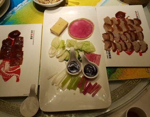 - 所以用餐当日,烤鸭都是在预计的时间里烤熟后直接送到包房,由专门厨师当场操作后,送上餐桌,服务很有特色
