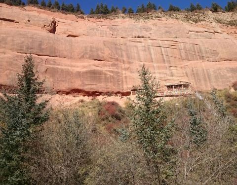 金塔寺座落在马蹄寺东南面,有东、西两大石窟,均开凿在陡峭的红石崖壁上