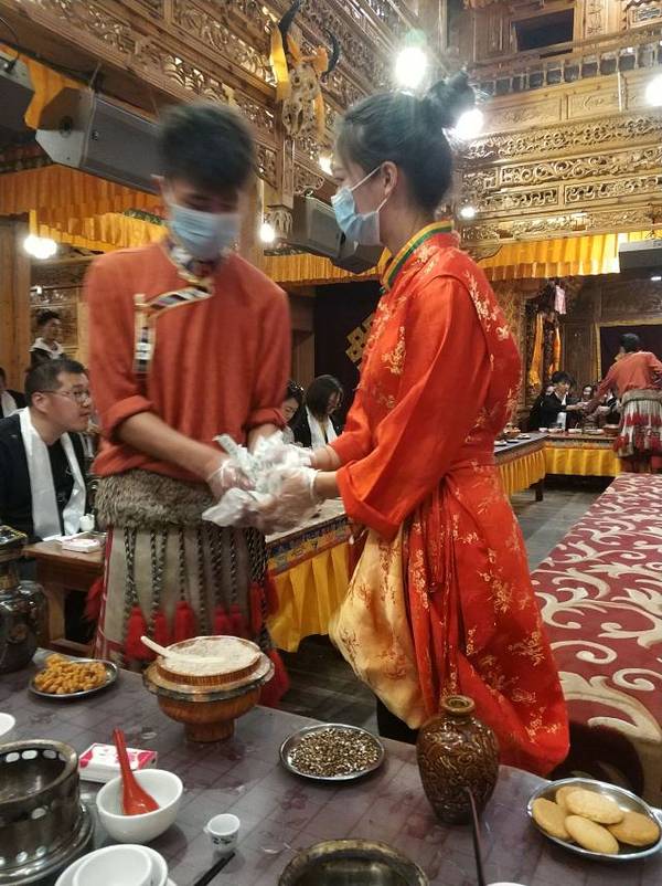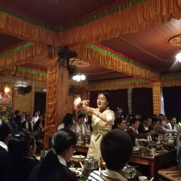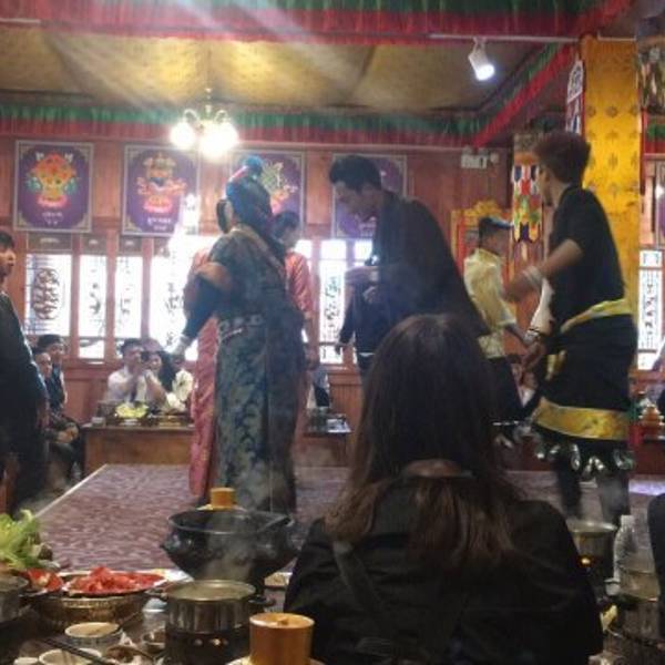 每人一个小火锅,想吃什么自己加,菜管够。还有当地的马奶茶吧好像,配上青稞面很好喝的。还有一些表演,藏民族的特殊舞蹈喝歌曲。进门吃饭前排队有两个卓玛(藏族女子统称)给你献哈达,扎西(藏族男子统称)帮拍照,吃饭期间也有卓玛帮你拍照,然后就会让你买照片,20元一张要不要看个人了。