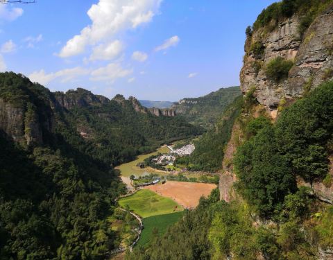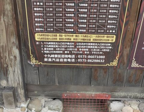 新昌十九峰位于新昌县西南,澄潭溪、韩妃溪之间,由十九峰、千丈幽谷、重阳宫三个子景区组成。这里的自然风光以丹霞地貌出彩,千丈幽谷还是央视《笑傲江湖》、《神雕侠侣》等武侠剧的取景地,武侠爱好者不容错过。 三个子景区是相邻的,也有道路相通。入口有两个,主入口在十九峰附近的雅庄村,自驾车从县道新蟠线可以方便地抵达;这边也有城乡客车经过,下车后过桥步行300米就到了景区停车场。另一个入口在千丈幽谷景区主入口一侧,自驾也方便,但是没有班车。绝大多数游客都是从雅庄村这边上山。 值得一看的是十九峰,虽然需要爬山,但山并不高,一般人慢些走问题不大。单独去千丈幽谷可乘车至重阳宫桥头,步行约20分钟到达(其间会穿过600米的隧道),或者连同重阳宫一并游玩。千丈幽谷在山下,基本上是平路,两小时左右即可逛完,比较轻松。许多游客会直接买联票,花上一天时间,从十九峰进千丈幽谷,接着游览重阳宫,或者反之,不走回头路。 十九峰内分布着十九座形状颜色瑰丽的突兀山峰,形状如香炉、缆船、马鞍、棋盘等等,在这些狭窄的山峰中穿行,虽然不如山下可一览群山,却自有一番腾云驾雾的仙境感觉。 由山下走到将军岩(新妇峰)大约40分钟,由此往右可去到望海峰(海拔400米左右),望海峰有一条近70度的一线天云梯,虽然台阶不到100级,有扶手可助力,但也让人气喘吁吁。将军岩往左则可去到马鞍峰,在峰顶的小亭子眺望山下两江汇合,远处不同颜色的田块如彩色平涂,脚下崖壁陡峭,左右的山势崎岖,是十九峰经典的景观。马鞍峰山腰的穿岩洞是天然形成的一个一人多高的大厅,洞前修了个半山腰的楼阁,亦可以观景。 由马鞍峰继续往前,是揽船峰和香炉峰,可以远观,也可以顺着小路登顶揽船峰后返回。回程路上可原路下山,也可选择通往千丈幽谷的岔路,走过小木桥,进入千丈幽谷景区。千丈幽谷大概一两小时就可游完,有竹林、溪水,还有许多峭壁和怪石。因为是武侠大片的取景地,景区里还有射雕草堂、卧龙山庄等人工景观,可以一边游赏一边回味武侠剧中的情节,会有种身临其境的感觉。千丈幽谷北侧的重阳宫是一处影视拍摄基地兼道观,游览时还可能碰到剧组在此拍戏。这边距离雅庄村大约两三公里。 穿岩十九峰的游玩需要半天或一天,若需要在此留宿,雅庄村内有大量的农家乐,标间60-100元左右。桥头的清幽居是其中的一家,除了有干净的房间,也有土鸡、溪鱼等美味供品尝。