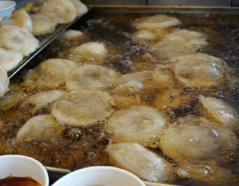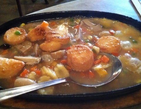 外皮是甘薯粉,里面是肉馅,先蒸后炸,然后浇上酱汁,皮子很Q,台湾好像叫做霸丸。这里的排骨汤毕竟有特色,苦瓜中间嵌的排骨,苦瓜也不苦。