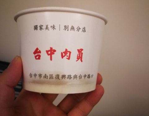 第一次吃到台湾的肉圆是在九份的一家店里,惊讶于奇怪的造型和口感后,慢慢就喜欢上了。前几天在彰化吃过肉圆后意犹未尽,在台中看到有评价很好的台中肉圆,就过来解解馋。 店铺离台中火车站不远,敞开式的环境,很简单、很干净。 肉圆很好吃。