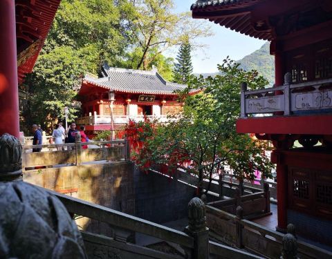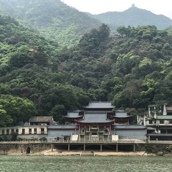 乘坐北江上游船,看两岸翠绿,心情极好!船老大应我们的要求靠岸,去了飞来寺。飞来寺的游客不多,建筑比较新。
