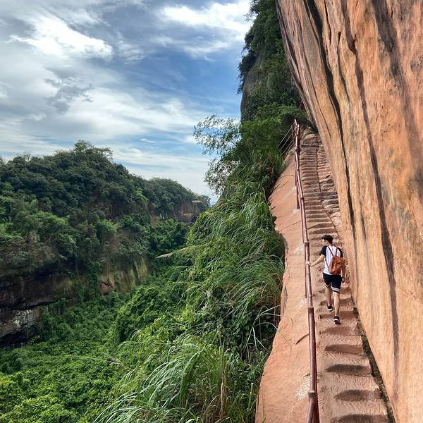 上顶后观日落非常棒,然后一路下山,就是云崖栈道,天已黑,路非常难走,差不多是在石缝里穿行,现在...10.3,选3号走是怕堵车,经过4个小时的车程来到目的地丹霞山,刚好到中午吃饭,就在住处旁随便找了一家,吃完就进景区。丹霞山分2处景点,阳元山和长老峰,前期做了功课,要玩好最少要2天行程,因这天只有半天了...10.3,选3号走是怕堵车,经过4个小时的车程来到目的地丹霞山,刚好到中午吃饭,就在住处旁随便找了一家,吃完就进景区。丹霞山分2处景点,阳元山和长老峰,前期做了功课,要玩好最少要2天行程,因这天只有半天了所以就先玩阳元山,因长老峰比较大需要1整天。阳元山很陡,正面路被封,只能下,就从玄机台上山,想到时间不够,就先去了通泰桥那边,通泰桥那边景点与阳元山是分开的2个景点,所以快马加鞭走完通泰桥,不是很陡大慨1.5H走完吧。下来后就从玄机台上山,已快到6点了,九九天梯这里很陡,上山需特别注意安全,我小子因跑到前面,人多又追不上,快到顶时太陡了估计有超过60度,足吓了我们一身冷汉。带小孩需特别注意一起上山,不然会吓死,回来后好好教育了一顿。