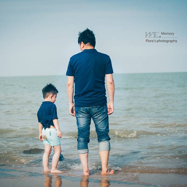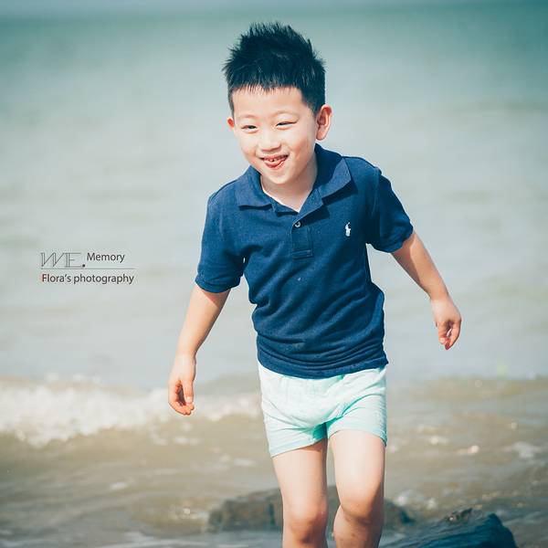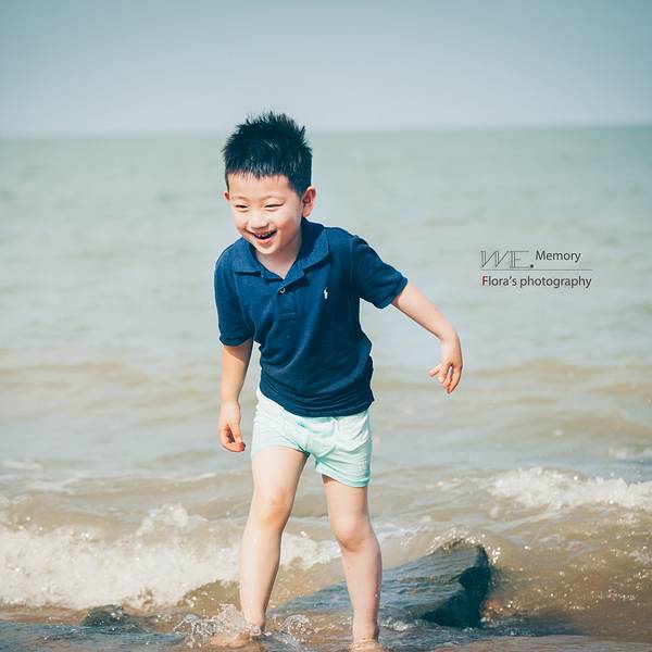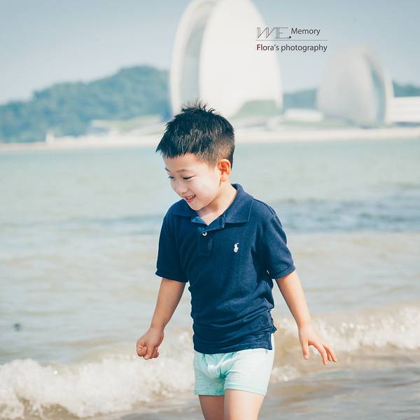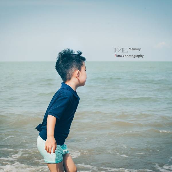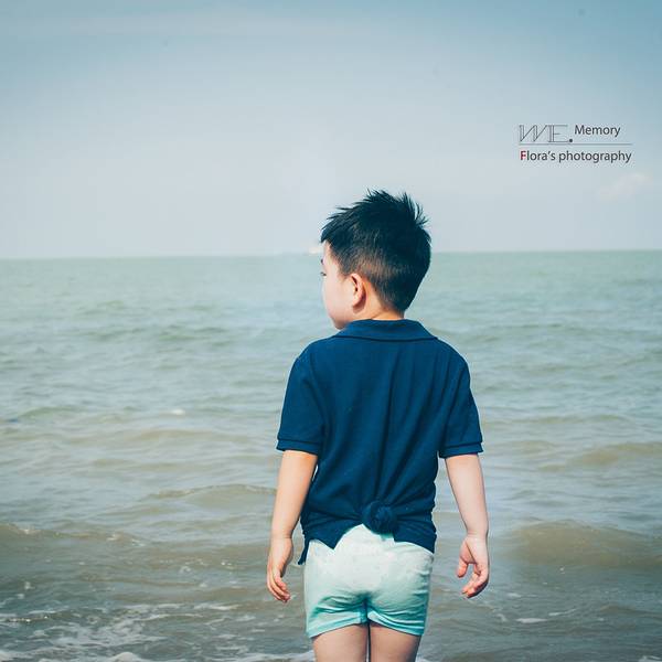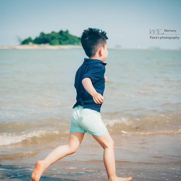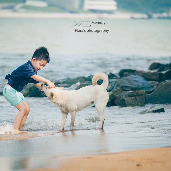 后来小狗儿跑过来和仔仔玩,夕阳渐沉,金色的光晕包裹着他们,仔仔大声说,妈妈快看啊,我替小狗挡着海浪呐~~
