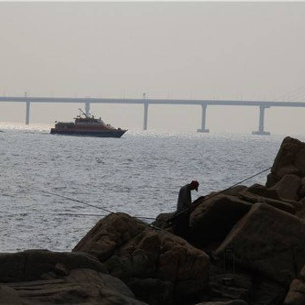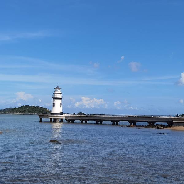 从珠海九州港头港口沿着情侣中路走向海滨公园,9路公交汽车要6—7站点,在海岸转过一个270度的大湾,遥远处眺望到渔女,海上有一只小船渔民挥舞“棒子”怕打水面,可能是在干鱼吧,漫漫长路走了一个小时,中途经过人造海滨泳场,看见了珠海象征标志……渔女雕像,留下舜间的美好印记。情路中路在州子路一处修建通往小岛的跨海桥,经过此处需要绕行到九州大道上。