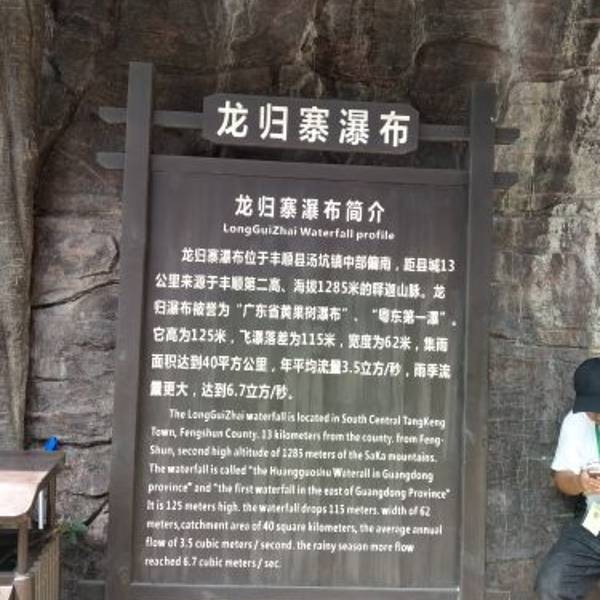 龙归寨瀑布位于广东省梅州市丰顺县汤坑镇以北的硿下村,距县城13公里。瀑布落差为125米,宽度62米,集雨面积40平方公里,平均流量3.5立方米/秒,雨季流量更大。其气势磅礴,似银河决口,从高空倾泻而下,潭面瀑布飞溅,犹如串串珍珠,被誉为“粤东第一瀑”。门票50元/人。