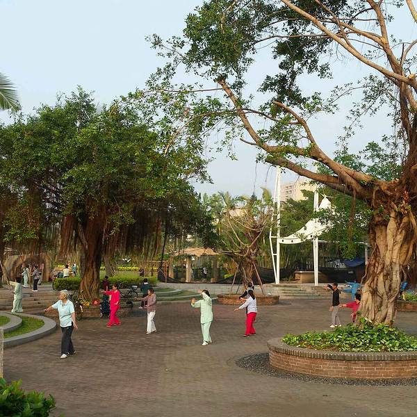 公园虽小人情不少,两河相会,绿草青青。游玩过客,三五成群。夕阳暮年,群歌群舞。