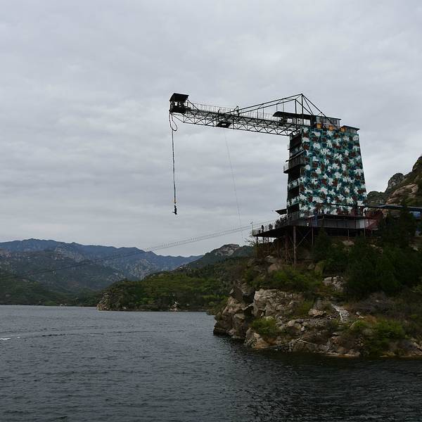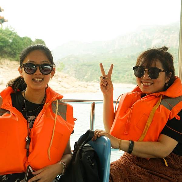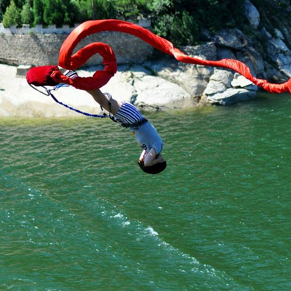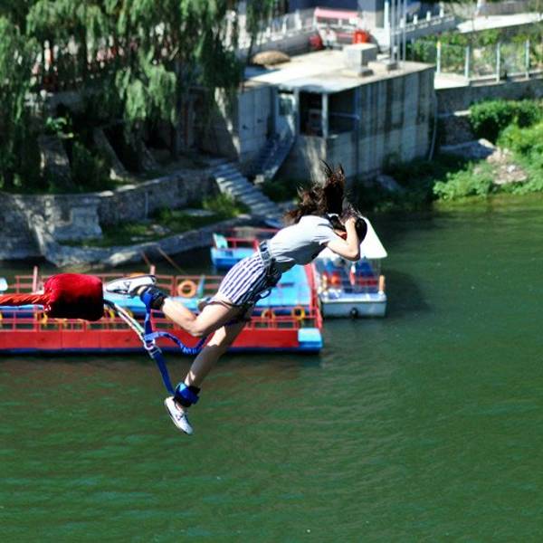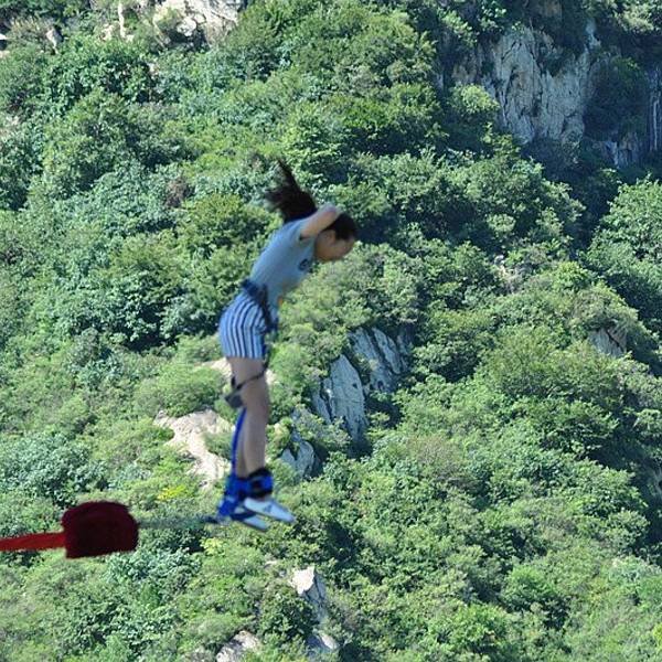重点来了! 蹦极!!!!!!! 真的是好兴奋好兴奋。 青龙峡位于怀柔区,我们住的地方又在南二环。大约有80km的样子。我们这次蹦极小组是5个人,所以索性租了辆车, 在北京的时间也不长,提前在网上租了一辆福特蒙迪欧,很是方便。担心路上堵车,加上蹦极人太多需要排队,我们7点不到就出发了。 可能是周末的原因,路上超级堵,据说北京市区的人也会在周末去怀柔游玩,出城的车格外多。 tips: 青龙峡 门票:成人票54元/人,学生票27元/人(注:大学生须在22周岁以下) 娱乐项目:蹦极 300元;速降80元(学生50)。 去蹦极必须进入景区,所以还要交门票钱。这也是很乏,毕竟我们蹦完极就走了,并没有逛景区。 网上说蹦极的人很多!! 都是骗人的。。。 我们11点到,一个人也没有,围观的到是很多。蹦极可以选择拍照和视频,是一套的,刻在光盘人, 我们5个人还给了优惠,果然是大户。 唯一的缺点,要自己爬楼梯!并没有电梯,是我们太天真啊。 站在60多米的高处,风超级大,感觉要被吹下去。 穿好装备,站在铁栅栏边上,之前所有的勇气都化为乌有。。。 工作人员在后面拽住腰部的绳,由于脚上绑了很重的沙袋,只要一松手, 我就直接下去了,根本不用跳。 没有把手的情况下,双手抱头,真的是孤立无援。 工作人员会问:跳吗? 我说: 再等等! 酝酿一下。 工作人员:酝酿什么,时间越长越不敢跳! 我说:一等!!! 话音还没落,他一松手,我就下去了!!! 那一瞬间,真的脑袋空白,竟然没有失重的感觉,好奇怪。 但是弹上来的那一刻,失重感就加强了。 反复了3次左右,湖面上就开了小船, 伸出来木棍,把我拉到了船上。 【bungee jumping】 就在一瞬间完成!!