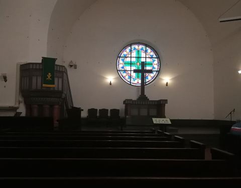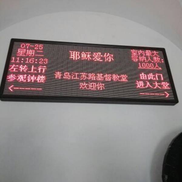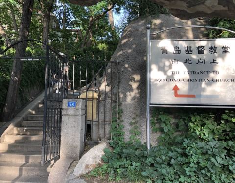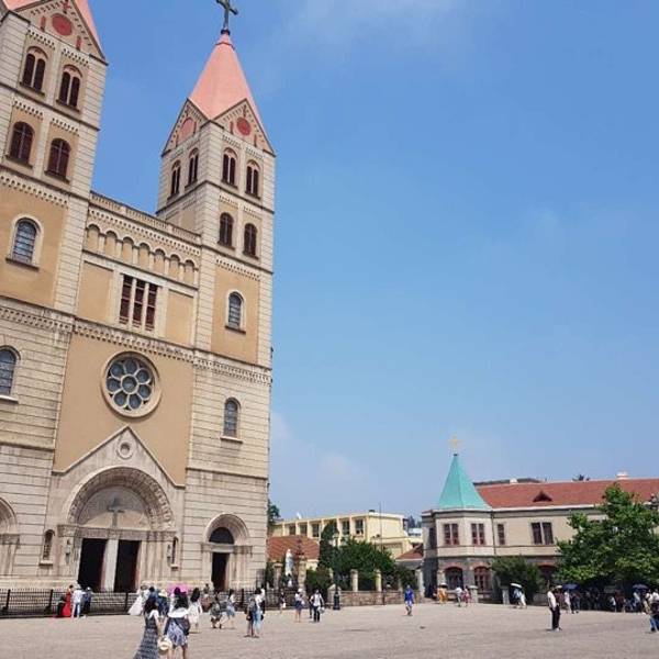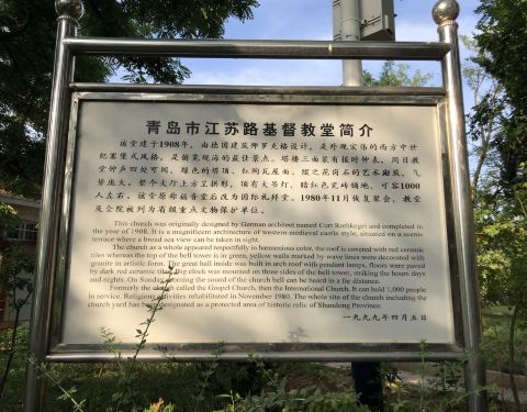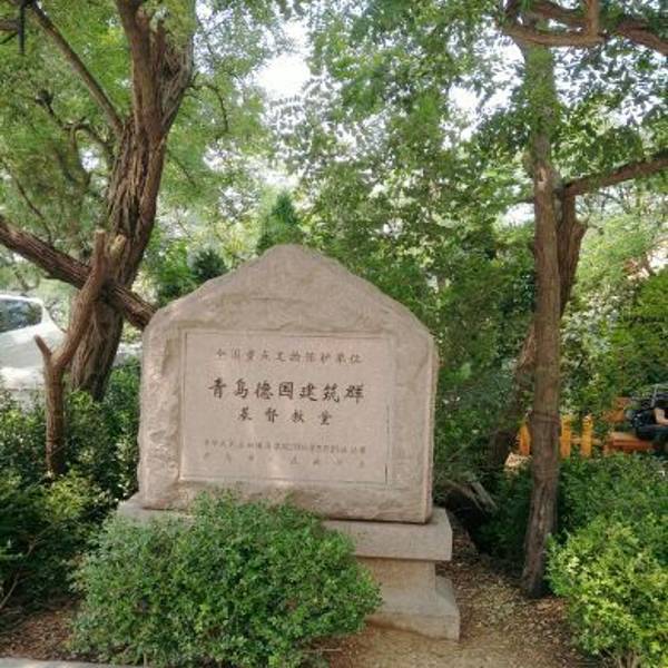 在信号山公园旁的一座小山丘上坐落着一栋经典的德国古堡式建筑,它就是青岛市江苏路基督教堂。由于它醒目的红色屋顶以及绿色尖顶的钟楼加上黄色外墙给人一种宗教建筑特有的美感,因此吸引着无数新人来此取景拍婚纱照。 教堂并不大,它是由钟楼和礼堂两部分组成,进入礼堂后,一眼便能看遍教堂,它没有天主教堂那样的富丽堂皇,内部布置的较为简单,教堂尽头有一圆形窗户,窗户前简单摆设着一个较大的十字架。而与其他教堂有所不同的是,教堂中的管风琴是摆放在进门处的二楼。 参观完礼堂登上钟楼,钟楼里面有一个机械装置可供游客参观,在钟楼的楼顶可以远眺大海。如今,钟楼里的大钟依然分秒不差地运转着,每逢周日钟声响起,每半个小时报时一次,浑厚的钟声透着庄严与肃穆,充满了宗教的神圣感。 教堂周围还有信号山公园和迎宾馆可以一起玩。较好的游览线路是先从该教堂-南门出(左转)-沿龙山路前行1公里至信号山公园(正门)-游览完之后正门出(左转)-沿龙山路前行500米至迎宾馆。