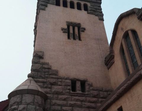 ...39.1米, 在上面可以观看远处大海的景色, 钟楼上部装两面时钟, 内部有一大两小3口德制洪钟它是一座典型的德国古堡式建筑, 由钟楼和礼堂两部分组成, 主要材料是花岗岩。 钟楼高39.1米, 在上面可以观看远处大海的景色, 钟楼上部装两面时钟, 内部有一大两小3口德制洪钟。