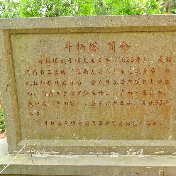 七星岭林密草茂,动植物资源丰富,野生动物有野猪、山鸡、野兔、山龟、坡马、日獭、狐狸、松鼠等几十种。野生经济植物有仁酸、山姜、山薯、白藤、牛牯大力等好几十种。斗柄塔矗立于七星岭主峰上尤如七星生柄,故得名斗柄塔。塔建于明朝天启五上(公元1625年),清朝光绪十三年(公无1887年)重修。塔平面作八角形,共七层,层层收缩递减,砖道以线砖与梭角子砖叠涩出檐,每层有拱门 ,内设螺旋式阶梯104级,拾级可登塔顶。塔高允20米,塔顶葫芦已废。现仅存覆盆,塔基围44.8米,塔身厚3.55米。塔门向西,门额石匾刻有"斗柄塔"三个字。上款刻"明天启五年孟冬月建造";下款刻"清交绪十三年孟重修"。斗柄塔斯社对望琼州海峡,过去商民船只经过此峡,因无航标,常有遇难,被认为是妖怪作崇。明代礼部尚书王宏诲(定安人)致仕后,以航标和镇妖为目的,邀众并奏请朝迁拨款建塔。此塔造型端庄稳重,雍容大方,踞高挺拔,耸入云霄,气势雄伟壮观。始建至今370多年,历尽沧桑,顶风傲雨,经受无数强台风及雷电袭击,依然巍然屹立,雄视海南惊涛骇流,眺望文北辽阔原野,不仅是海上航运和渔船作业的特殊航标,而且,是研究海南古塔的发展历的可贵的实物资料。
