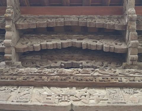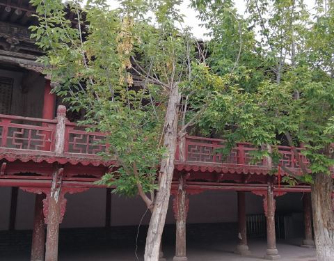山西会馆,始建于清雍正二年,山门、戏楼、观戏楼、钟鼓楼、牌坊、厢房、大殿均保存完整,是张掖保存最完整的一组清代古建筑群,其木雕石刻精美,泥塑彩绘古朴,颇具三晋特色。山门并不开放,从大佛寺内进入即可。山西会馆旧存砖雕四幅,为清朝作品,均以若干方砖拼接雕刻,内容分别是‘三阳开泰’、‘福天富地’、‘龙吐宝珠’、‘鹿鹤同春’四个吉祥术语,祈愿美好开始,寓意富贵长寿,每幅砖雕由龙、虎、蝙蝠、羊、鹿、鹤等吉祥动物,瑞兽与椿树、兰草、茂竹、水仙、灵芝、梅花等瑞草组成,并间以灵石、祥云、日月海水,以谐音、象征的手法构成美好的祝辞及画面,线条粗放简练,刀法古朴浑厚。由此,说说晋商,国人皆知这是清代国内势力最雄厚的商帮,晋商除创立和发展了享誉全国的票号外,在茶叶贸易上,运销地区包括了湖广陕甘新疆青海等省以及俄英等国,仅光绪年间张掖的山西帮号就有44家,除常见的市内交易、乡下集镇贸易外,还有众多的店铺,出售布、絮、裘、褐、毡、毛、皮及铜、锡、铁器等日用品,可以说,晋商往来贸易活跃并促进了清代张掖地方经济的繁荣与发展。大佛寺内至今仍保存有两块重修山西会馆碑记,依稀可见,一块是光绪十八年立,另一块是民国八年,如今的会馆,人去馆空,罕有人气,坐在馆内,听深树鸟鸣,闻戏楼余音,品古建遗韵,叹人生百态,匆匆百年,不过尔尔。