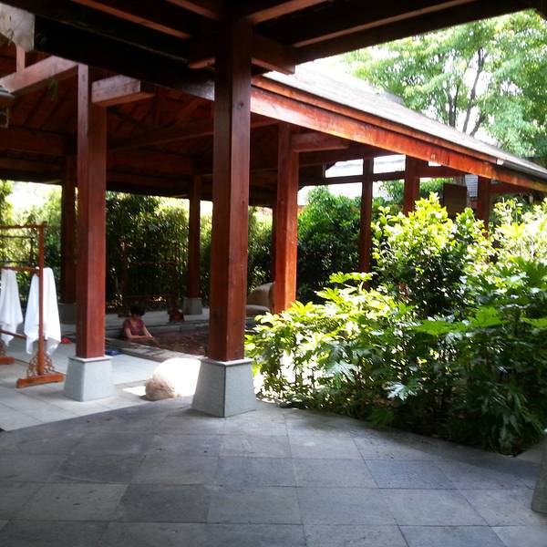 温泉里有免费提供的茶水,泡温泉要及时补充水分,石板浴也是很受欢迎的,躺在温热的石板上整个人都放松了。想刺激一点,去矿砂浴把自己埋起来。温泉里有木屋SPA,适合女性朋友,环境非常隐秘,木屋旁边种着茂密的竹林,环境清新自然。