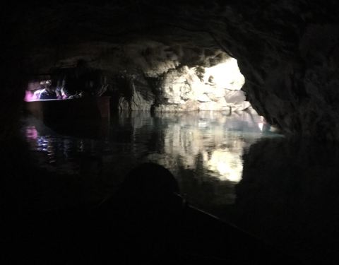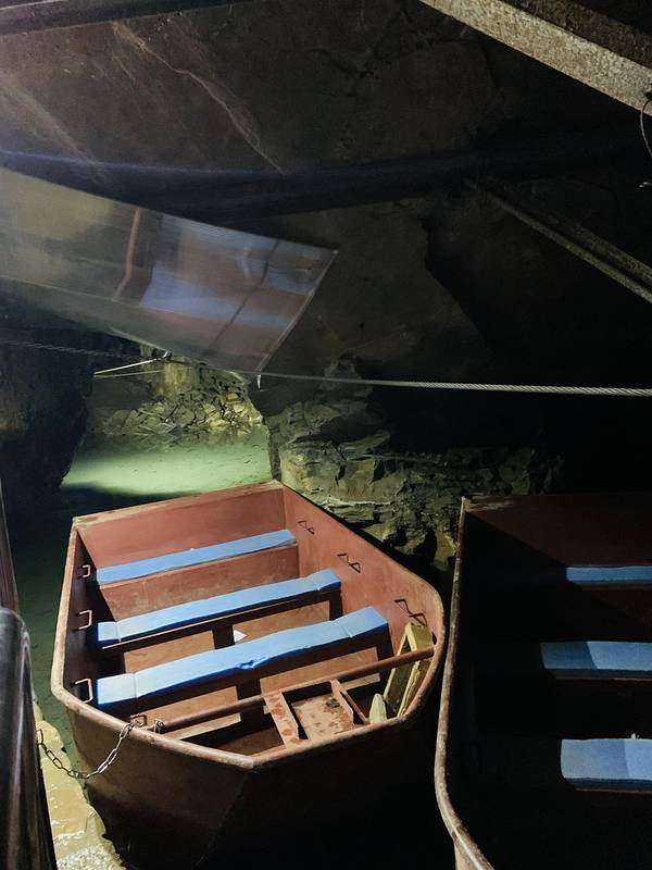 洞内总共有两个船,每个船可以坐9个人左右,工作人员会等游客到齐了一起出发,整体游船行程大概10多分钟。游船是人力前行,洞穴顶部有固定的绳索,工作人员会拉着绳索引导船前行。河水非常的清澈,配上景观灯,很好看。要注意的是,洞内河道的顶部和两边空间比较狭窄,坐船的时候一定注意不要磕碰到头。游船到一个地方就会原路返回了,工作人员说前边还有瀑布,但是比较危险,所以就没再往前划。
