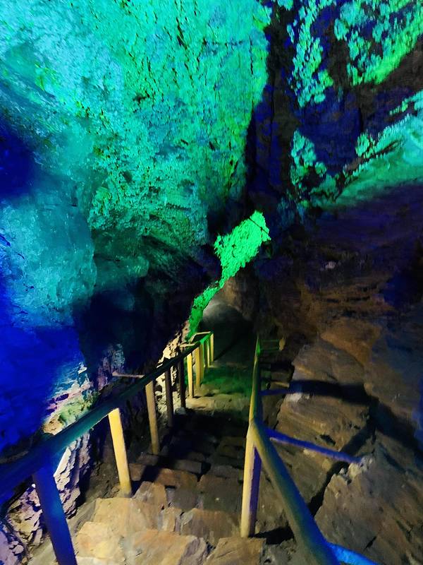 进入洞里先是一个很深的向下的台阶,洞内各处都有引路灯和五颜六色的景观灯,所以看清路线还是没有问题的,只是台阶较多,洞内两边和头顶也有不规则的石壁,所以还是下台阶还是要小心一些。走到深处就能看到各种形状的石钟乳,景区为这些石钟乳赋予了很多形象的名字,并做了保护,所以大家一定要爱惜这些大自然的产物。洞穴内有几处分岔口,按照游览路标前行即可,实在拿不定主义可以问同行的工作人员,看到“华北地下河探秘”这个大标牌的时候,往台阶下走一段就到了坐船的地方了,大标牌这块记得先不要沿着指示牌上楼梯,那样就往出口走了,会错过坐船。