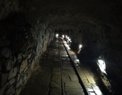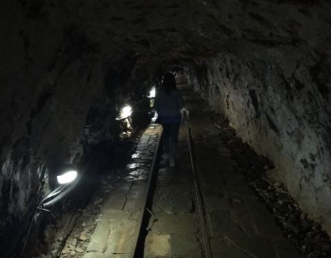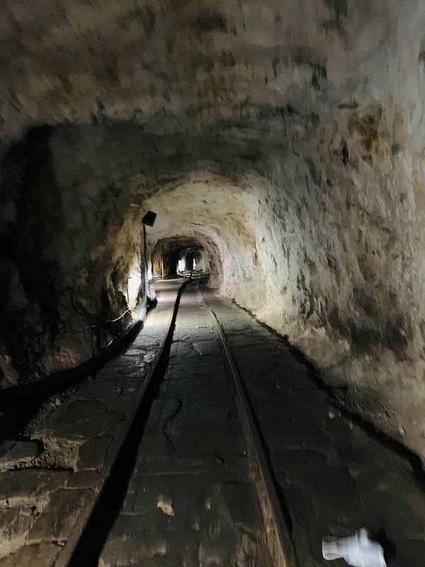 坐完游船沿着游览指示牌继续前行,就开始往上走了,这一段能看到银狐洞最有名的银狐形状的钟乳石。再往前走一段就是漫长的运煤隧道,因为这里最早的时候是采煤隧道,后来发现了洞穴,改造成了如今的银狐洞景区,因此这条隧道也就保留了下来,供游客游览。隧道内有很长的轨道,并且还能看到当年工人使用的小火车,只是现在没法乘坐了。隧道说是有500米,实际上肯定不止,我估计得有1公里。隧道到头就是往出口的向上台阶了,这里才是全程最考验体力的地方,估计得有2、3百米,看着都得深吸一口凉气,爬上去一身是汗。所以,一不是很建议带老人来,二也如果不是特别冷,不建议在门口租冲锋衣了。