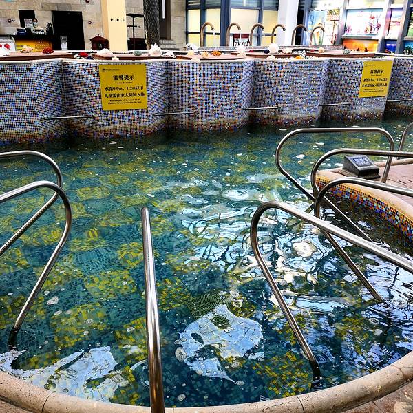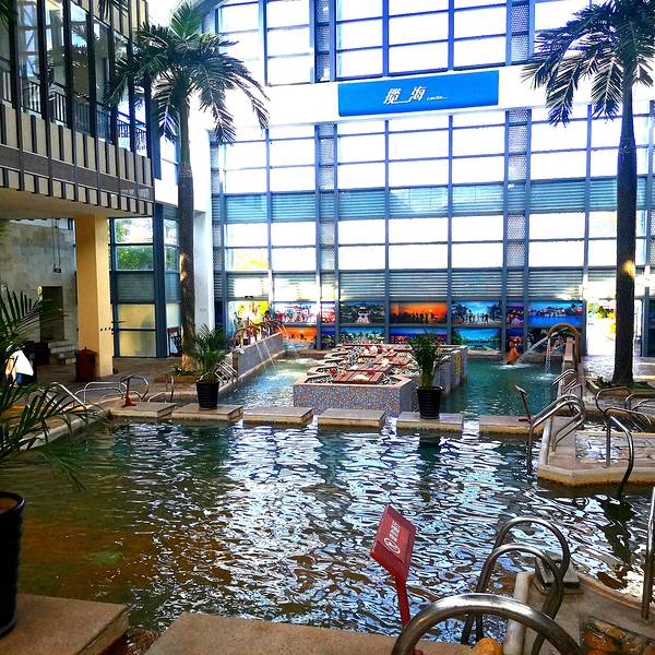 当然是挨个临幸啦。揽海其实就是个恒温游泳池,估计是热身用的,可以在里面游泳、打水仗,还有站在高压出水口下,借助水压按摩身体。东方区看起来就比较神秘了,里面有来自中国的神农泉、天盐浴、火宫浴、韩国的汗蒸幕、大长今,海洋矿物泥浴、石之泉等等。但是根据目测,里面大部分都是需要另外付费的spa按摩项目,就是一个个小黑屋,推门进去一个工作人员笑眯眯地看着你“要服务吗?”的那种。抠门的我们只进去看了两眼,就直接出来了。