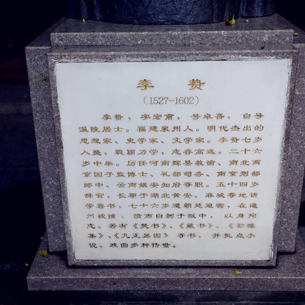 ...加上读简介不到10分钟就可以游完,看了之后才知道李贽是何许人也,比较适合学校组织活动的教育场所房子不大,走一圈不到两分钟,里面有些李贽的介绍,加上读简介不到10分钟就可以游完,看了之后才知道李贽是何许人也,比较适合学校组织活动的教育场所。