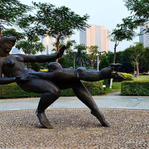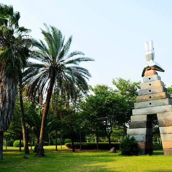 东园河边游艇码头有白鹭女神雕像,白鹭女神身姿优美、跪坐在一块巨大岩石上梳理长发,肩上还停着一只小白鹭,它是厦门的标志性雕塑。雕像前的大草坪附近有很多广场鸽,完全不怕人,可以躺在草坪上晒晒太阳、喂喂鸽子,这里也是孩子们的乐园。
