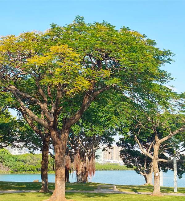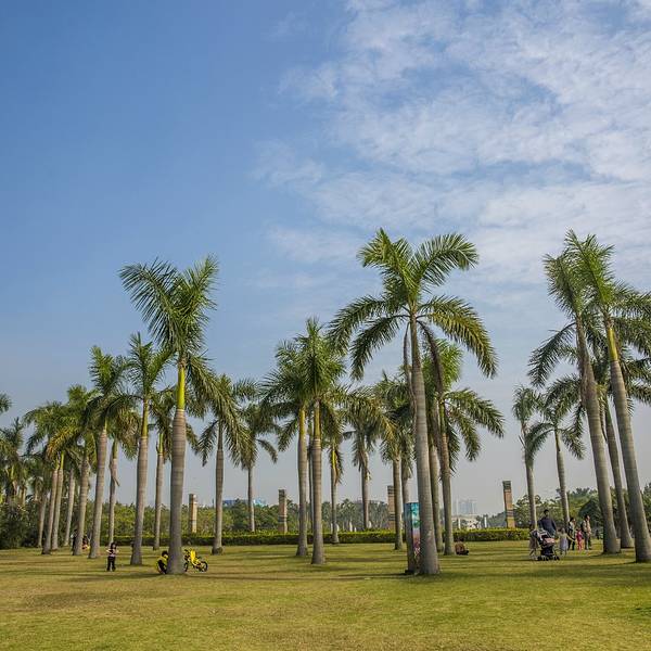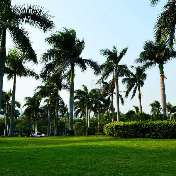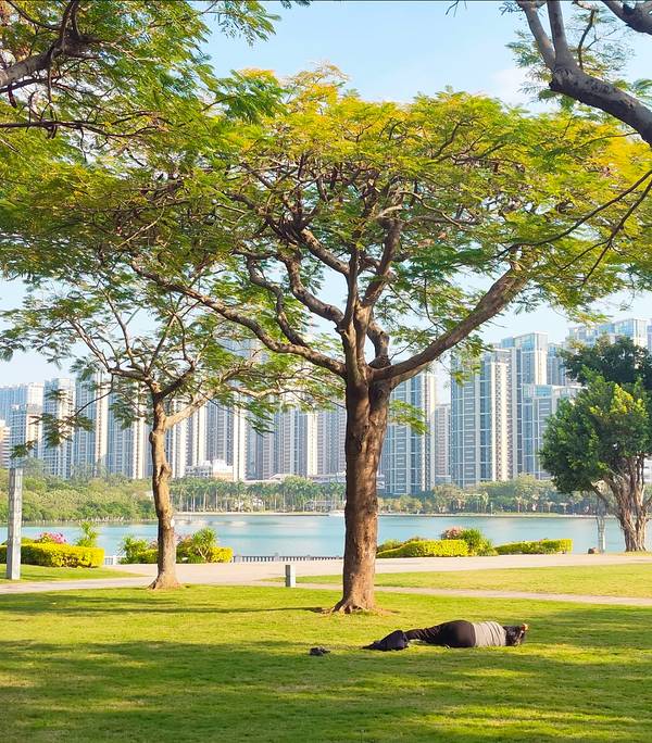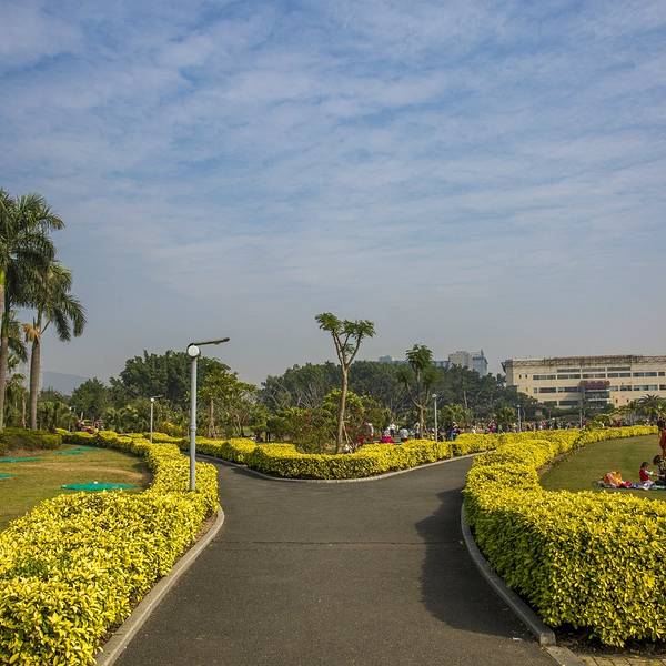 草坪区是另一处宝藏地。大草坪像块修剪整齐的绿绒毯,周末永远挤满了人却不显得嘈杂:孩子们追着鸽子跑,年轻人铺着野餐垫分享咖啡,老人带着孙辈放风筝,甚至有摄影爱好者蹲在花丛旁拍蝴蝶。最动人的是秋日午后,阳光透过凤凰木的枝叶洒下光斑,有人弹吉他,有人轻声唱歌,风里飘着桂花的甜香,时光仿佛都慢了下来。