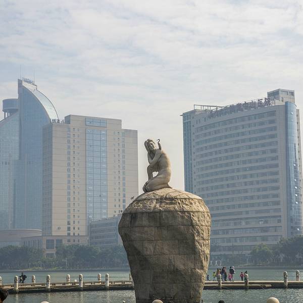 ,白鹭女神身姿优美、娴静地跪坐在一块巨岩上梳理长发,肩上还停着一只小白鹭,它是厦门的标志性雕塑,游客可以来此拍照留念。周末及节假日的晚上来,可以看到音乐喷泉和灯光秀。