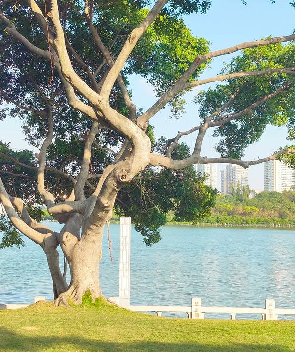公园最妙的是与城市的“若即若离”。从湖滨南路拐进公园入口,前一秒还是高楼林立的商务区,后一秒便被浓密的榕树荫包裹,车流声被蝉鸣与鸟鸣取代,这种“瞬间切换”的魔力,在都市公园中实属难得。