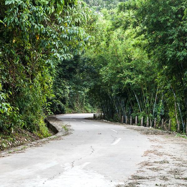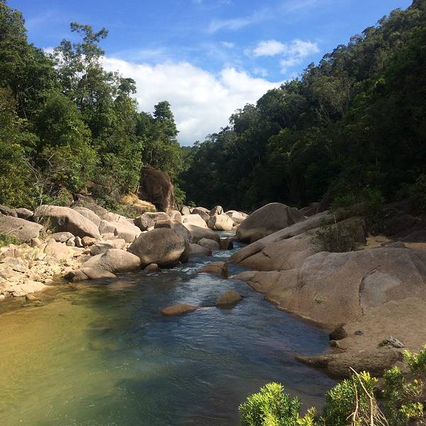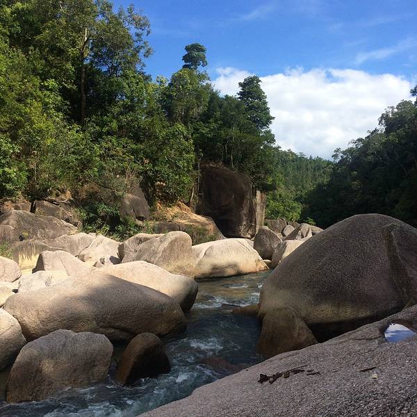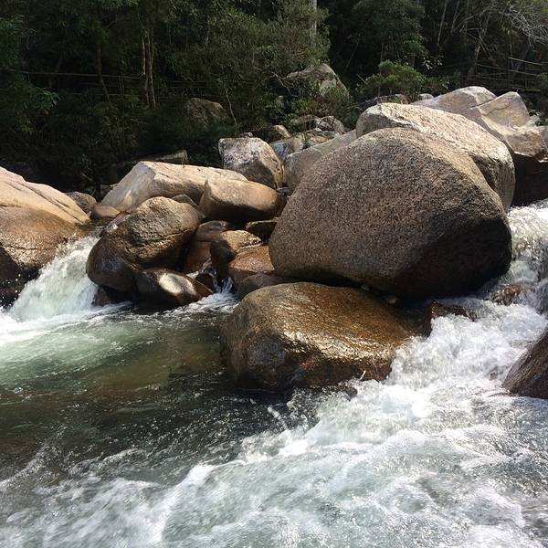 前路坎坷起来,颠簸的小路,中间停了一两处,涧水清澈,巨石堆垒,景色优美。直到进了雨林谷度假村,我们还在纳闷,这雨林谷在哪呢?
