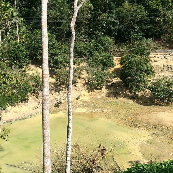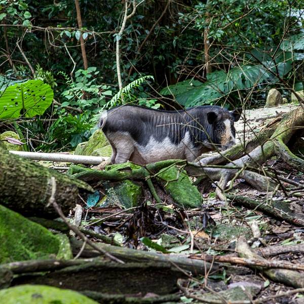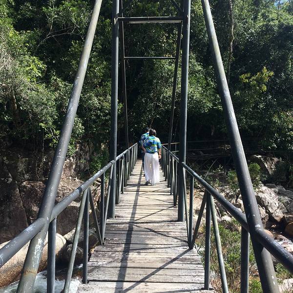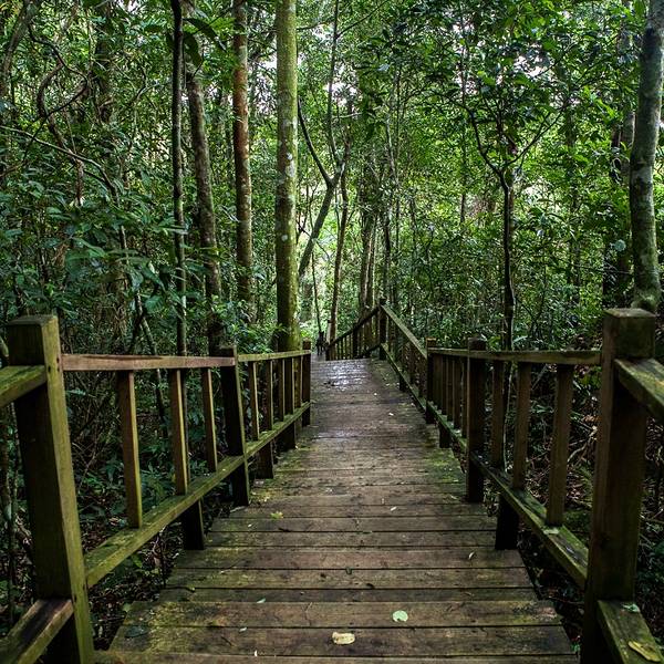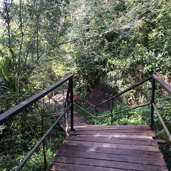 转来转去,在度假村里看过了外表风蚀严重的度假别墅,放养的小猪。最后,终于沿着一个不起眼的小路,进了神秘的雨林谷。先闻其声的河水,激流汹涌,沿河栈道隐匿在茂密的雨林中。这样的情景,令人脑海中不断浮现出雨林探险的念头来。