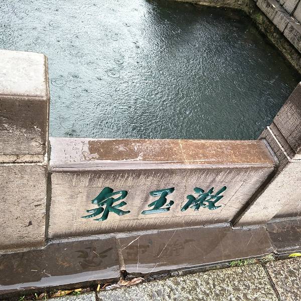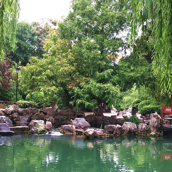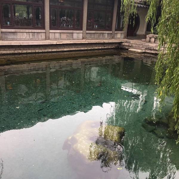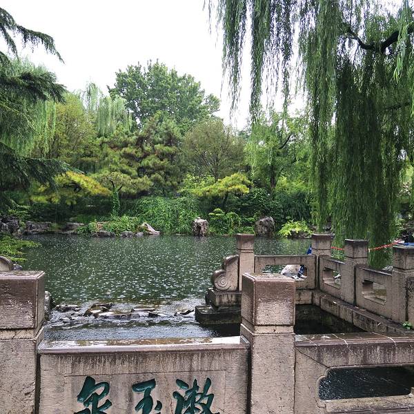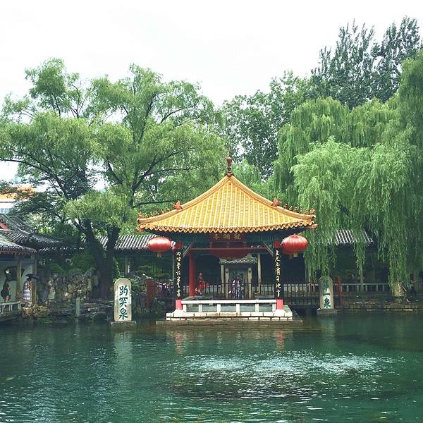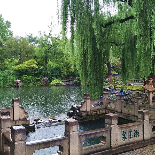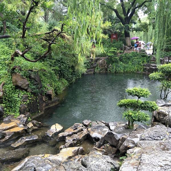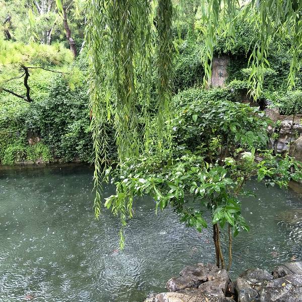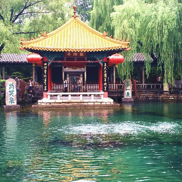 漱玉泉是进趵突泉公园里面后见到的第一眼有名的泉眼,而且此泉附近风景优美,因此合影的游人络绎不绝,即使我们是雨天冒雨游玩,也很难抢到拍照的好时机呀~所以想出好照片还是要早点来呀~漱玉泉跟后面的一个小池塘相连,池水碧绿,清澈见底,还有不少鱼儿在池子里自由自在地游来游去,真是快活!漱玉泉边种有很多数,特别突出的一棵挺拔的松树,看起来已经有一定的年头了呢,松树旁边立着一块石碑,上书“鸢飞鱼跃”,这是漱玉泉鼎盛时期的美景吧。我们是8月份的时候去的趵突泉公园,泉边的垂枝繁叶茂,垂在泉眼边,倒映在全眼里,真有一种穿越到江南的错觉。泉水潺潺流向小池塘,清澈见底。
