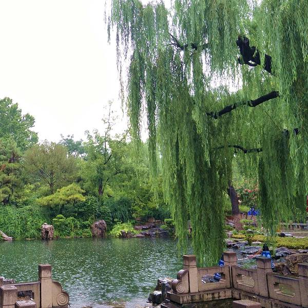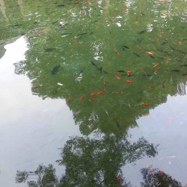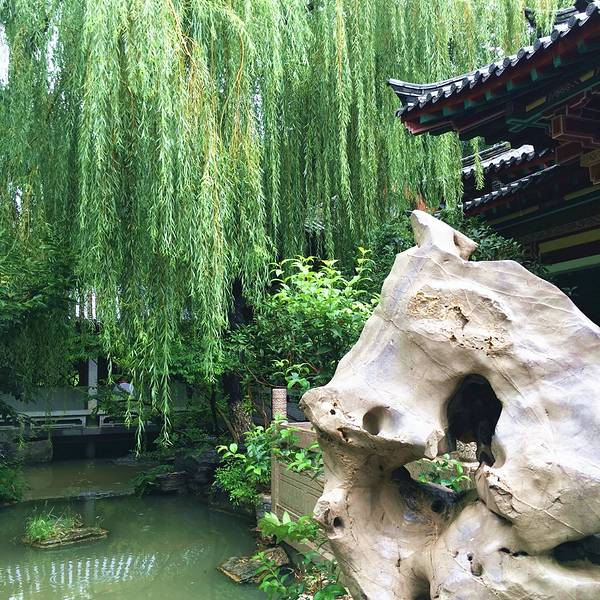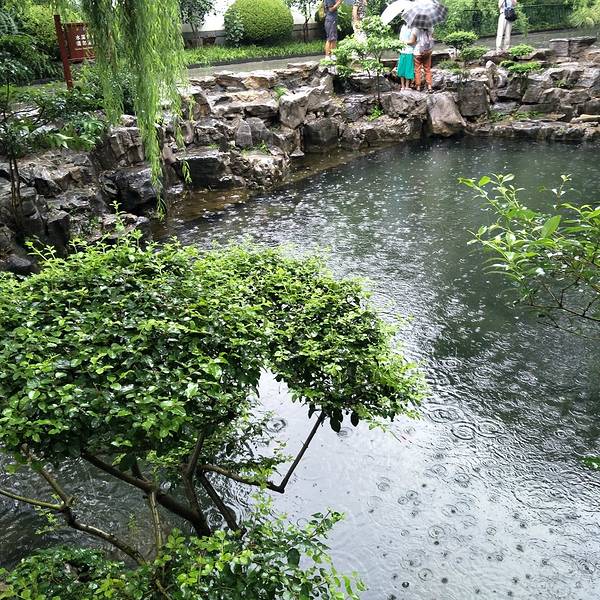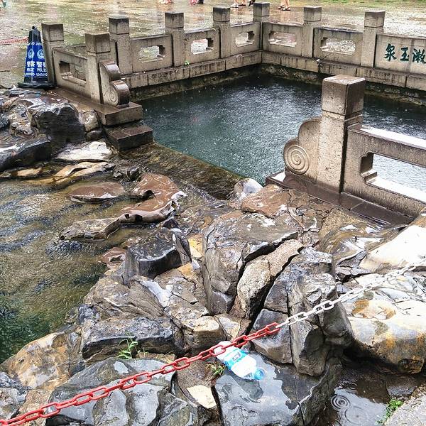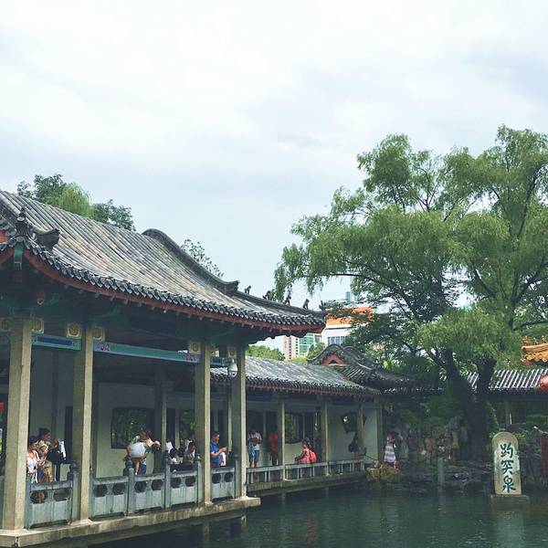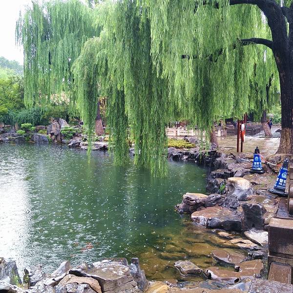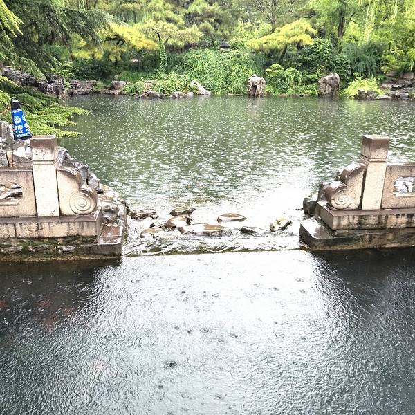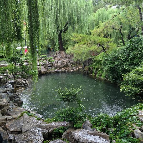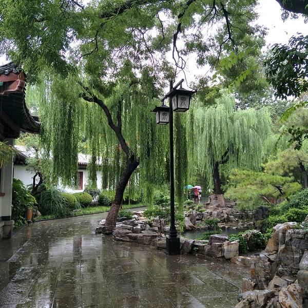 漱玉泉是进趵突泉公园里面后见到的第一眼有名的泉眼,而且此泉附近风景优美,因此合影的游人络绎不绝,即使我们是雨天冒雨游玩,也很难抢到拍照的好时机呀~所以想出好照片还是要早点来呀~漱玉泉跟后面的一个小池塘相连,池水碧绿,清澈见底,还有不少鱼儿在池子里自由自在地游来游去,真是快活!漱玉泉边种有很多数,特别突出的一棵挺拔的松树,看起来已经有一定的年头了呢,松树旁边立着一块石碑,上书“鸢飞鱼跃”,这是漱玉泉鼎盛时期的美景吧。我们是8月份的时候去的趵突泉公园,泉边的垂枝繁叶茂,垂在泉眼边,倒映在全眼里,真有一种穿越到江南的错觉。泉水潺潺流向小池塘,清澈见底。