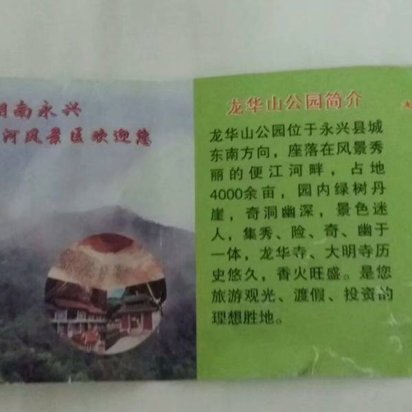 ...庄、穿坦、丹霞蜂窝岩、临江亭等,丹霞地貌景观,青山绿水环绕,景色非常秀丽优美,是休闲旅游好出去永兴的龙华山公园面积很大,位于便江河畔,主要景点龙华寺、大明寺、鹅公寨塔、龙华山庄、穿坦、丹霞蜂窝岩、临江亭等,丹霞地貌景观,青山绿水环绕,景色非常秀丽优美,是休闲旅游好出去 2019-06-15 17:05