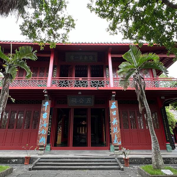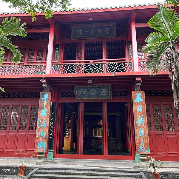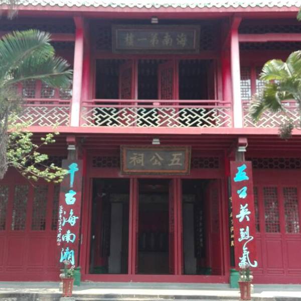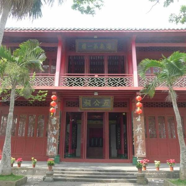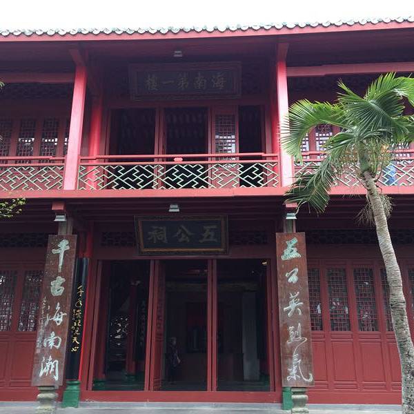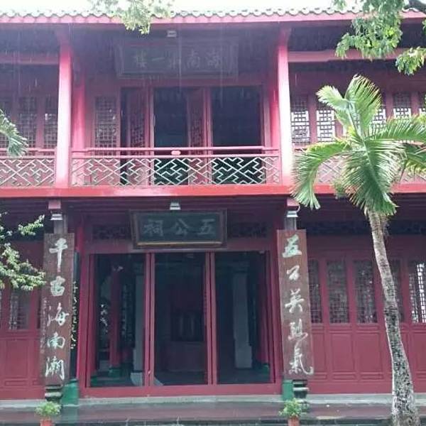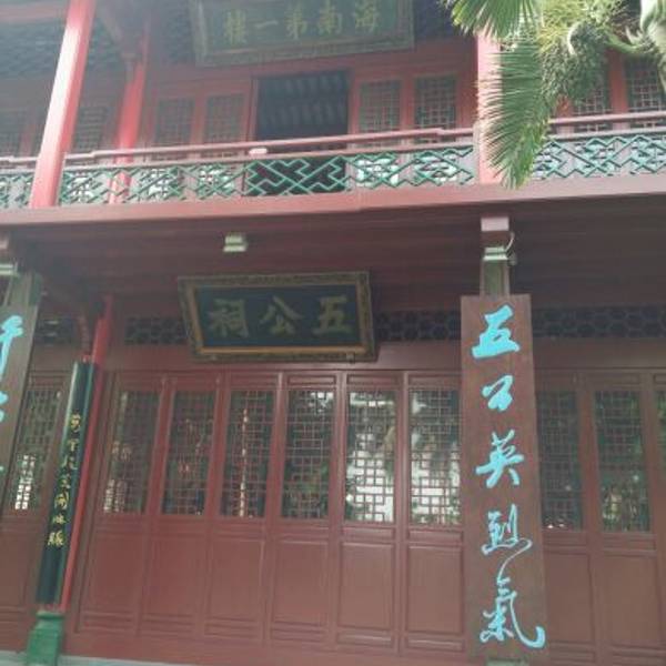 五公祠位于海口市区,是展示中国古代贬官文化、海南历史文化及具有海南特色的古代建筑艺术的文物古迹。该祠是为纪念唐、宋时期贬谪到海南岛的五位历史人物而建的,故名五公祠。这是一幢用上等木料精心构筑的红楼,分上下两层,四角攒尖式的屋顶,素瓦红掾,与四周烂漫的绿叶繁枝相辉映,显得格外的庄严肃穆。 游玩时首先从苏公祠进入,苏公祠往左,即是合祭五位名臣的五公祠。五公祠主楼是一幢用上等木料精心构筑的红楼,楼高十几米,学圃堂里陈列的明代铜禁钟、清代铁洪钟和三门大铁炮是五公祠的镇祠之宝。接着可以到观稼堂里“寻根问祖”,在这里可知海南人的祖先主要来自福建和广东。从苏公祠往右,还有两伏波祠,这里祭祀西汉伏波将军路博德和东汉伏波将军马援。两位将军曾先后征讨岭南,开琼崖、詹耳等九郡。 五公祠的对面是海口市博物馆,二者是连通的。这里原来是五公祠陈列馆,里面展品不是很多,陈列了一些海南名人的生平和作品,有兴趣可以和五公祠一并游览。