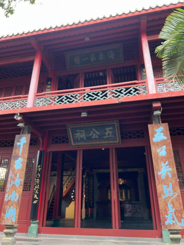 苏公祠旁边就是五公祠,五公祠并不巍峨,是一幢只有两层的木质建筑,但它却有着“海南第一楼”的美誉。现存建筑是在清朝由雷琼道台朱采于光绪十五年(1889年)主持修建,并同时增建和重建了观稼堂、学圃堂、西斋。祠内奉祀唐、宋两代被贬来琼的李德裕、李纲、赵鼎、李光、胡铨五位历史名臣,俗称“五公”。五公祠之所以称为海南第一楼,其根本原因就在于建筑规模和所奉祀的“五公”高风亮节的品德在当时都堪称第一。