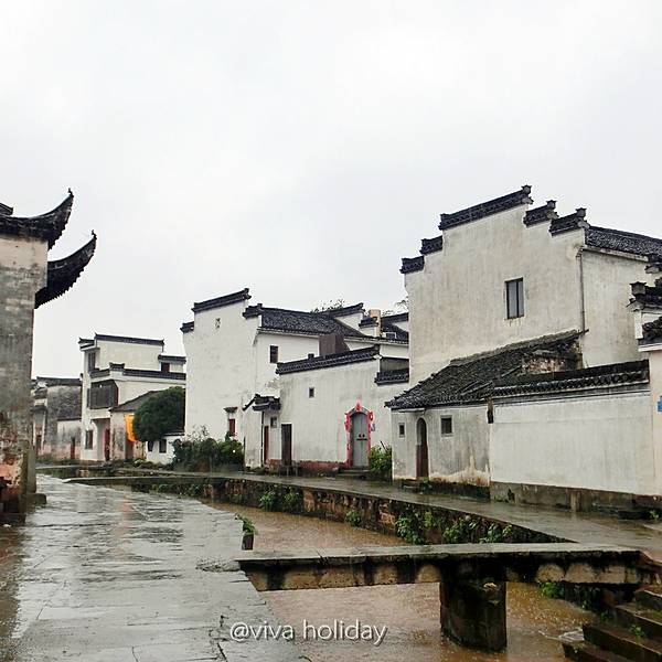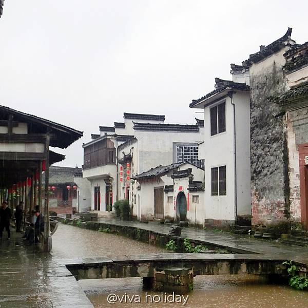 2.水街是唐模的最特色,石板大桥夹溪而行,店铺民居面水而立,平桥相通,长廊覆盖,与闹市迥异,有古韵风情。避雨长廊下设有美人靠,走累了不妨临水而坐,看看美院学生的写生,惬意十足。
