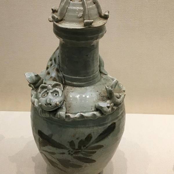 我先上了二楼,闽越文化展区里陈列着些土陶瓦罐。有个灰陶匏壶颇有趣味,形如葫芦,壶嘴却歪向一边,想是当年匠人信手捏来的。玻璃柜前站着对老夫妇,老先生对着展品指指点点,老太太只管点头,也不知听进去几分。