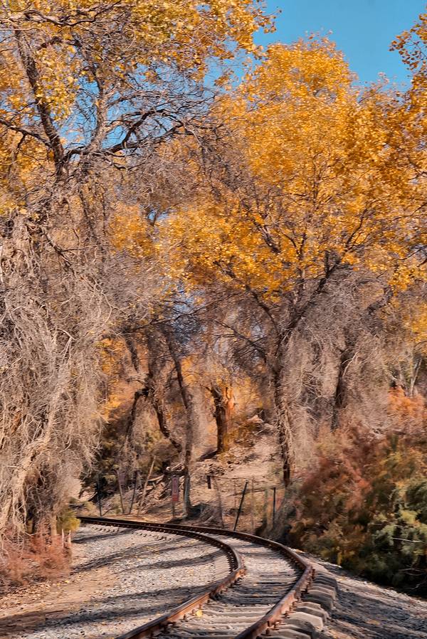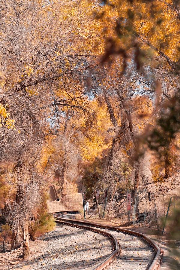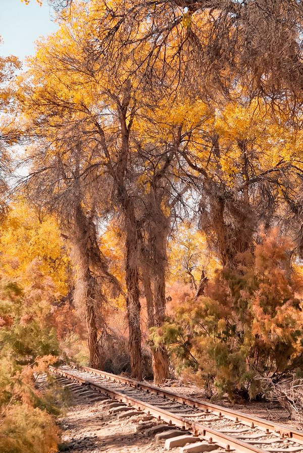 在最美的秋天来到南疆的我们,又怎么会轻易错过秋天的这一抹金黄呢。看过南疆金黄色的胡杨,才算是来过秋天的南疆吧。轮台塔里木胡杨林国家森林公园位于塔里木河中游,胡杨林占地面积40余万亩,是塔里木胡杨保护区的核心区域,曾被《中国国家地理》杂志评选为“中国最美的十大森林公园”之一。大面积的胡杨林与河流、沙漠、戈壁、绿洲、沙湖、古道、及荒漠草原融为一体。在最美的季节遇见最美的它,相比于其它地方的胡杨林,塔里木胡杨林确实让人更震撼!走进塔里木胡杨林,仿佛看到一个神奇的世界,这里的胡杨姿态各异,有的像士兵站得笔直,有的像舞蹈员摆出了优美的造型,有的如妙龄女子妩媚多姿...走进胡杨林那一刻就觉得自己走进了一座天然艺术宫殿。秋日的塔里木,大片的胡杨,在时光的轮回中,悄悄换了金黄。金色的阳光,金色的胡杨,金黄色的树叶在阳光的照耀下,更是层林尽染,美轮美奂,将单调的沙漠装点得像童话世界般美丽。在金黄的树影间你会惊觉:“这才是秋天啊”!沿着环形游览小铁路往胡杨深处走,你会发现,在湛蓝天空下的胡杨,在阳光的照射下,金黄的颜色更加夺目,满是岁月痕迹的金黄胡杨和小铁路,共同组成一幅五彩斑斓的油画。走在满是金黄的小铁路旁,满目都是美。在塔里木胡杨林里,你可以步行游览,也可以坐上观光小火车穿行在金黄色的胡杨林里,铁路两旁尽是金色胡杨,仿佛坐上一列开往童话世界的列车,浪漫又惬意!【小tips】