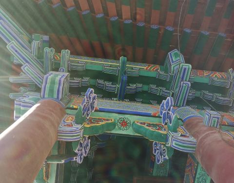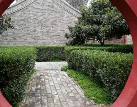 今天早上先去嘉应观,这是当时的“黄河治理办公室” 嘉应观位于河南焦作武陟县城东南12公里处,距焦作市区35公里,总面积9.3平方公里,始建于清雍正元年,是雍正皇帝为祭祀河神,封赏历代治河功臣,而修建的的座集宫、庙、衙三位一体黄淮诸河龙王庙,建筑风格形似故宫,主要包括山门、御碑亭、治河功臣殿、中大殿、禹王阁等,规模宏大,有“北京小故宫”之美誉。高墙内是缩小版的故宫,有精致的碑帖和钟鼓楼,在钟楼敲了个钟,声音悠扬传到远方。院子里有一颗古老的大榆树,枝叶都是垂下来的,所以又叫“五体投地”。在树叶的婆娑中钟声回响,很适合静静发呆。在嘉应观的院子里发现了一顶轿子,在轿子的窗口摆造型,拍得非常开心。